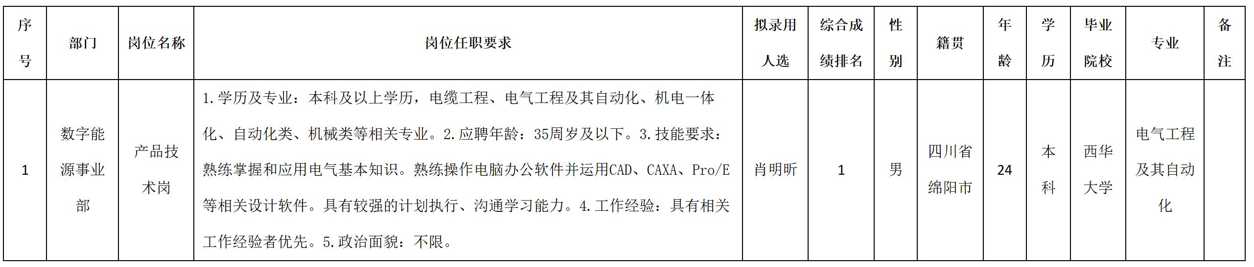 根據(jù)四川九洲線纜有限責任公司發(fā)布的招聘公告及招聘相關(guān)規(guī)定,經(jīng)測試、考察、體檢等程序,擬錄用肖明昕同志到四川九洲線纜有限責任公司工作,現(xiàn)予以公示,具體情況如下: