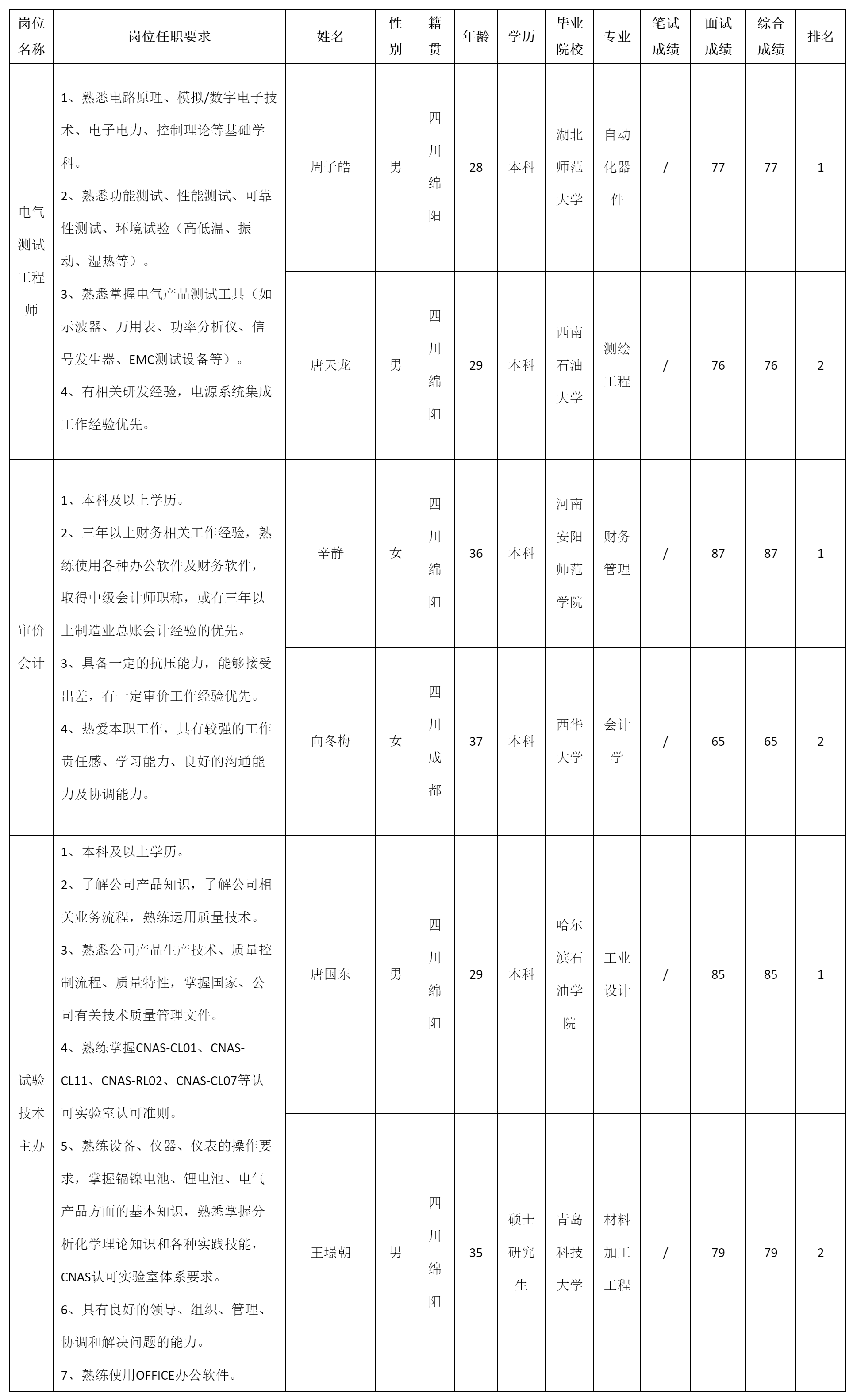 根據(jù)長虹電源公司發(fā)布的招聘公告及招聘相關(guān)規(guī)定,經(jīng)面試等程序,現(xiàn)將面試成績予以公示。