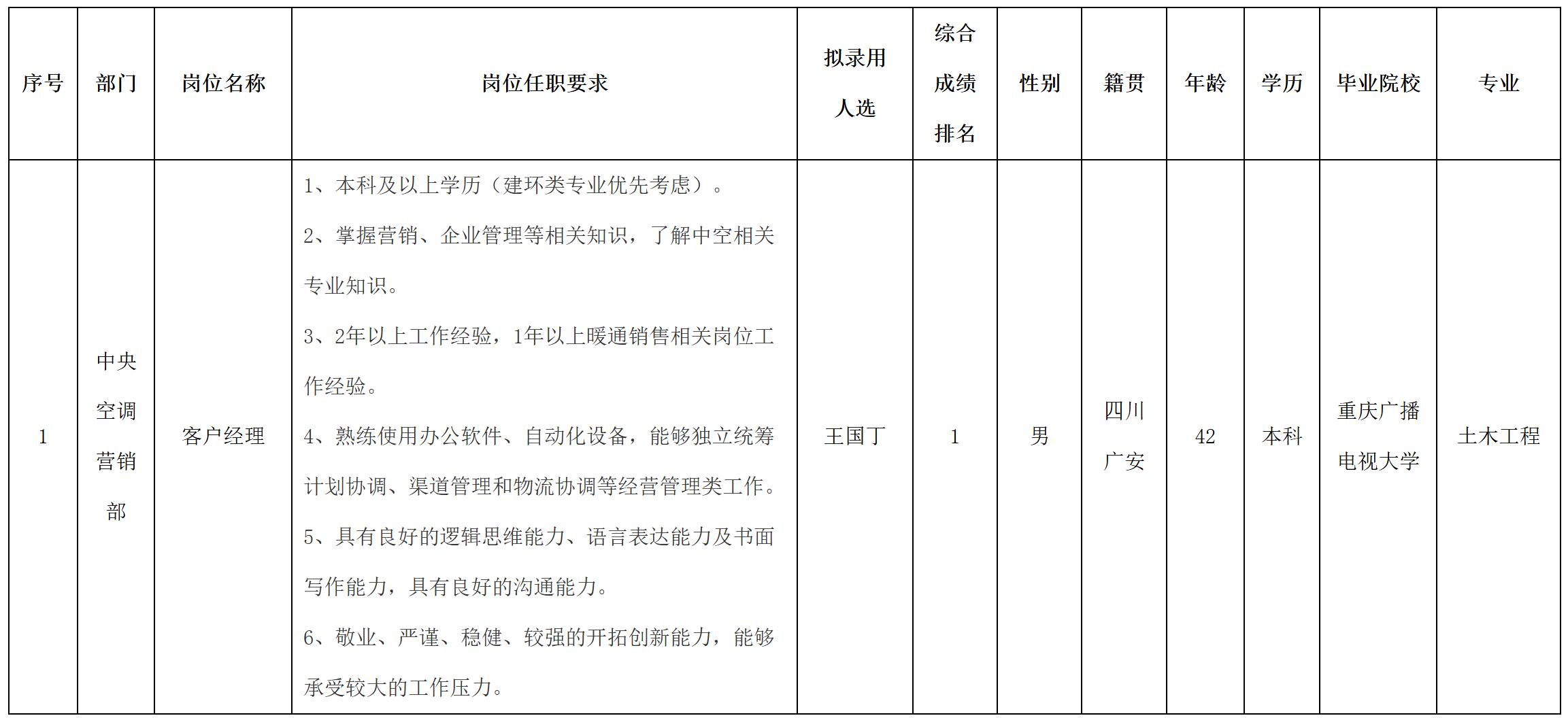 根據(jù)四川長(zhǎng)虹空調(diào)有限公司發(fā)布的招聘公告及招聘相關(guān)規(guī)定,經(jīng)面試,擬錄用王國(guó)丁到長(zhǎng)虹空調(diào)工作,現(xiàn)予以公示,具體情況如下: