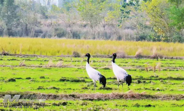 11月26日,在安州區(qū)黃土鎮(zhèn)民生村的一片農(nóng)田里,兩只黑頸鶴正悠然漫步、探頭覓食。不遠(yuǎn)處,村民們正忙著用玉米、小麥等為它們準(zhǔn)備專屬“晚餐”。[