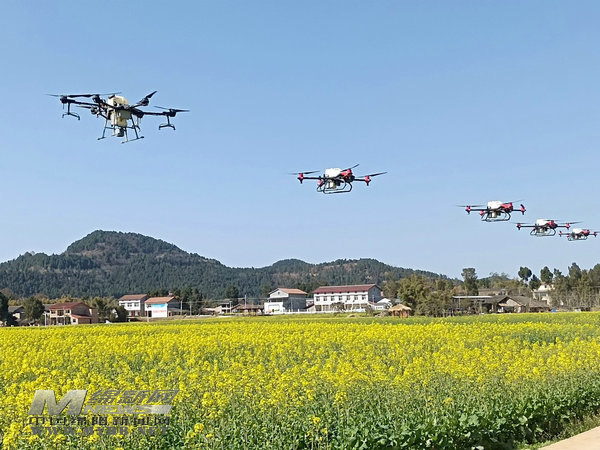 最近幾天,天氣晴好,梓潼縣的植保無人機(jī)“飛手”操作九架植保“小飛機(jī)”飛翔在田間地頭,給油菜大田打藥,防治病蟲害及補(bǔ)硼作業(yè)。 [